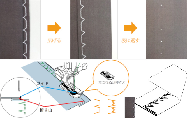 縫い方には袋とじ縫いやまつり縫いなどの種類が有り、使用する針やルーパーの形状で縫い目が変わります。
